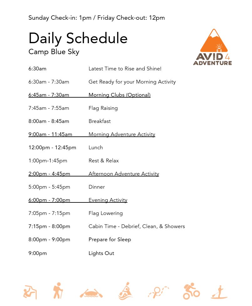 Camp schedules vary from day to day depending on the group and day, but here’s a typical schedule: